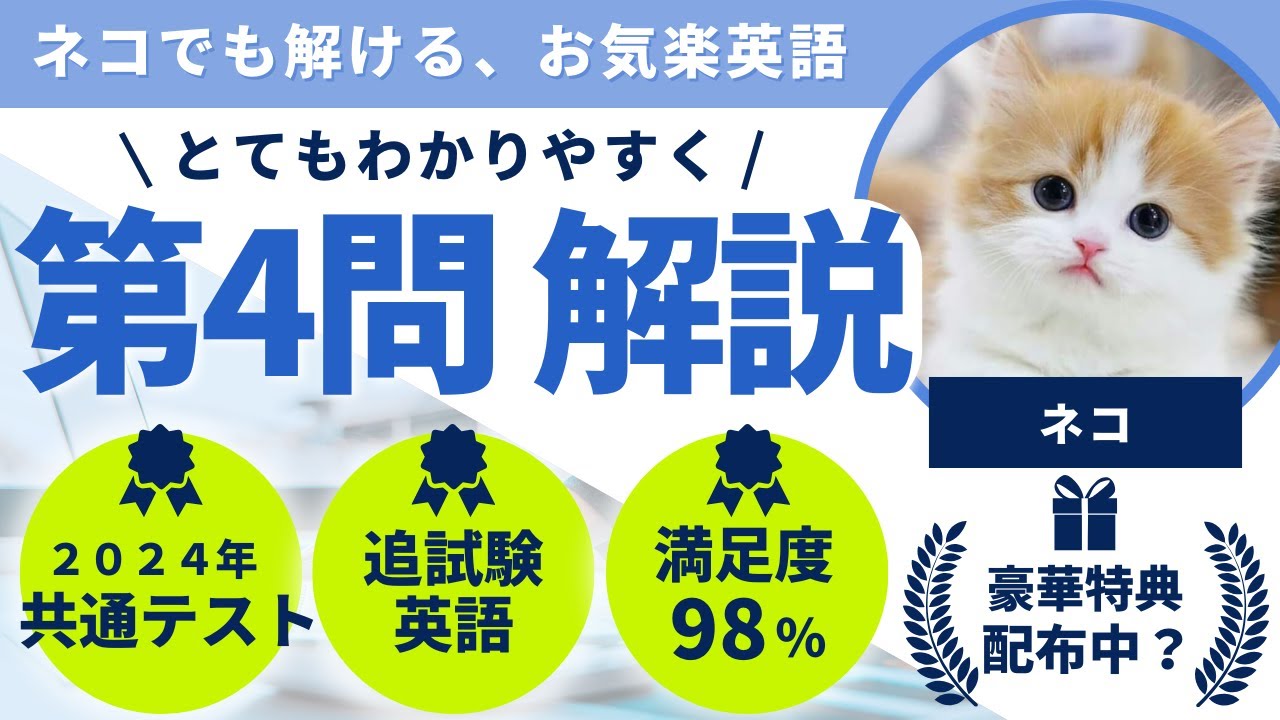 2024年度の大学入学共通テスト追試験英語第4問の解説をしています。疑問点が残らないよう、解き方の手順も踏まえて一問一問どこよりも丁寧に説明します。