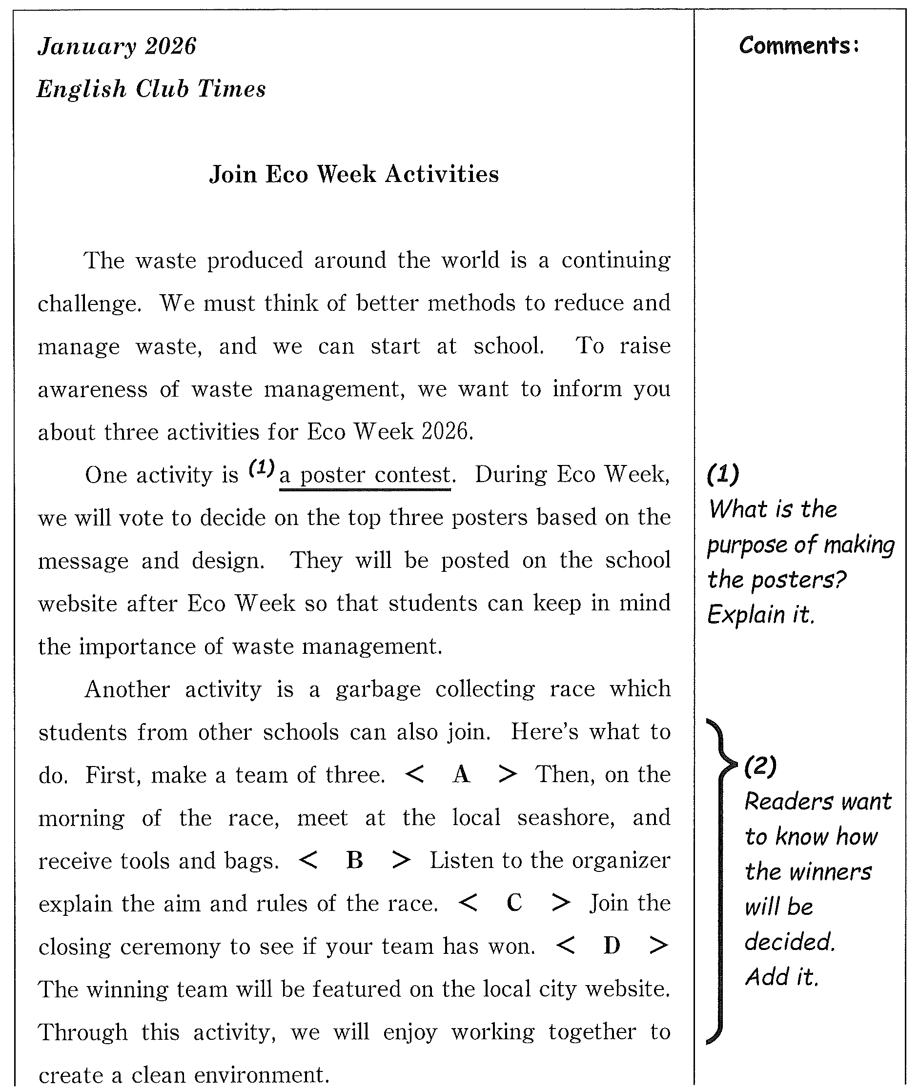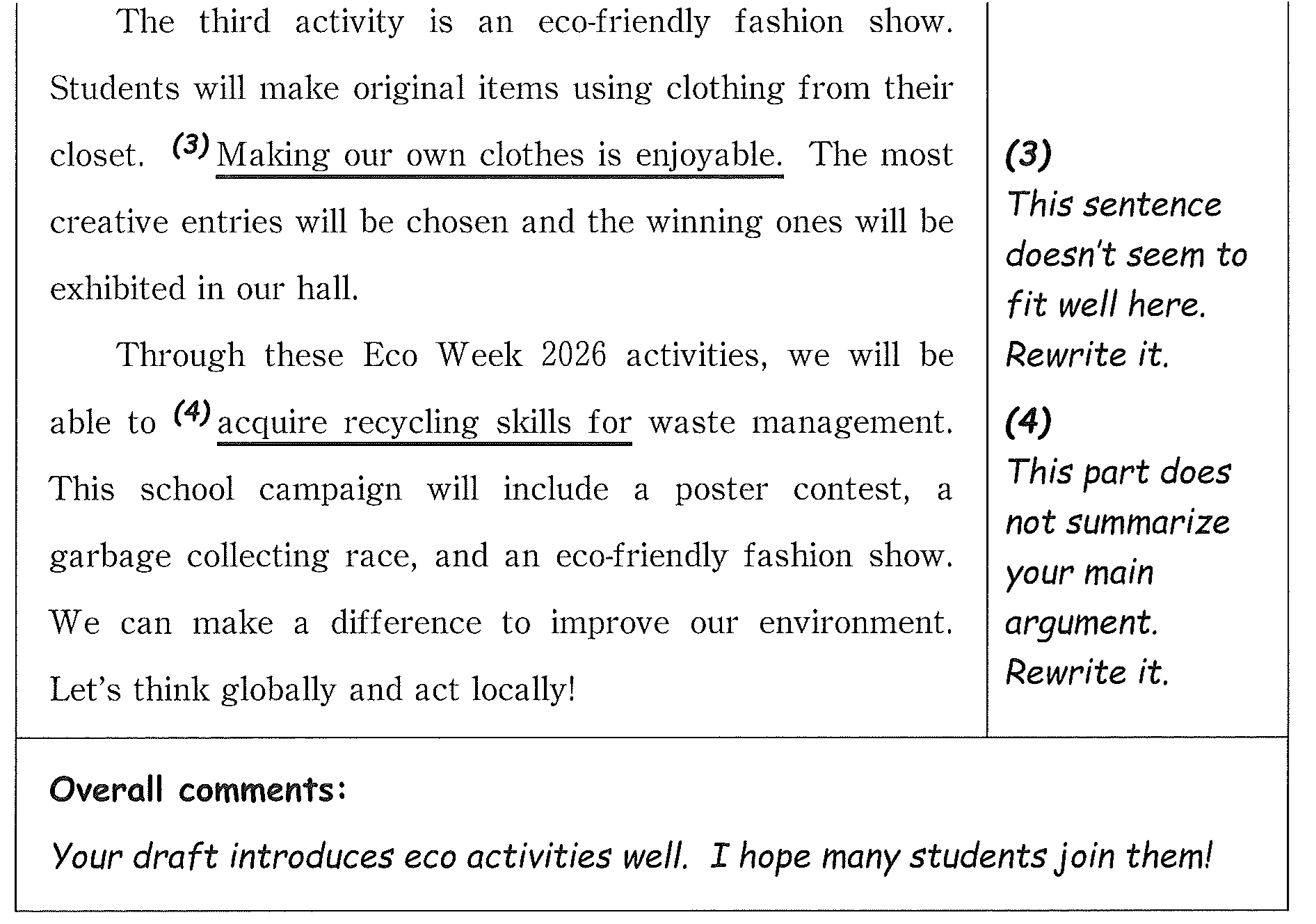 In English Club, you are writing an online newsletter to promote your high school’s Eco Week theme of waste management. This is your most recent draft with comments from club supervisor.