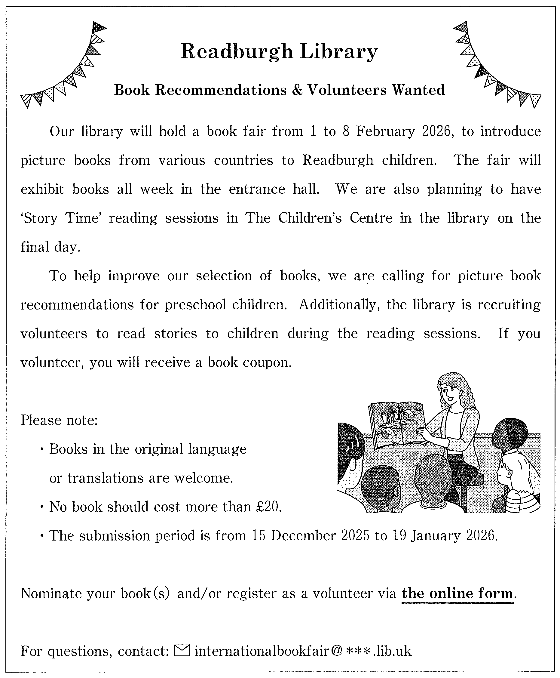 Our library will hold a book fair from 1 to 8 February 2026, to introduce picture books from various countries to Readburgh children.