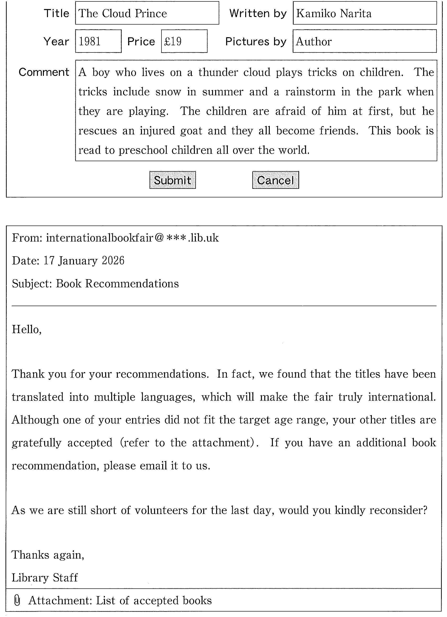 Although one of your entries did not fit the target age range, your other titles are gratefully accepted (refer to the attachment).