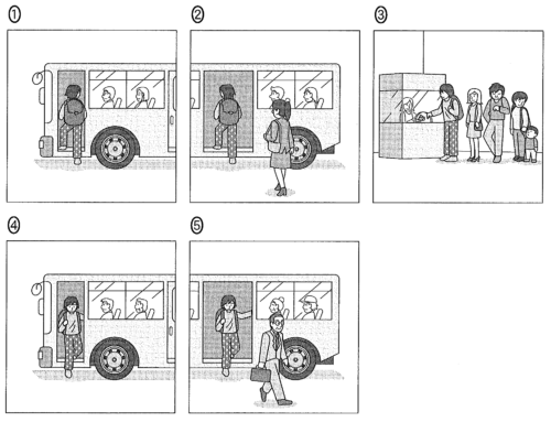 最初に図を確認したときには、切符を買って、バスのどちらから乗って、どちらから降りるのかという問題と想定するでしょう。しかし、そうするとバスの図が2つ余ることになってしまいます。2回バスに乗るなら、「3」は必要ないと考えられますね。バス料金の支払い方法はいろいろありますから、そういうことを知らない人は戸惑ってしまうかもしれませんね。